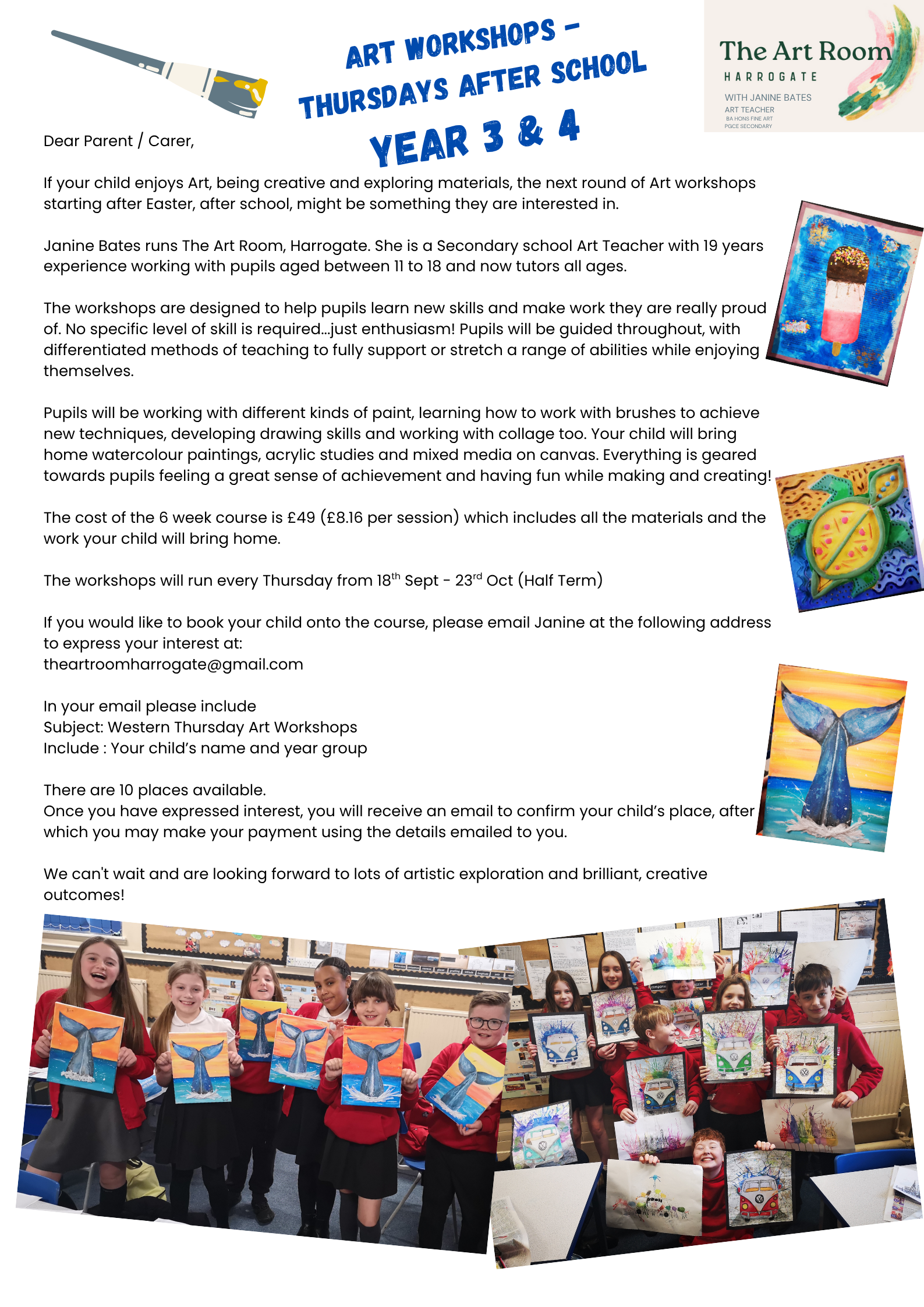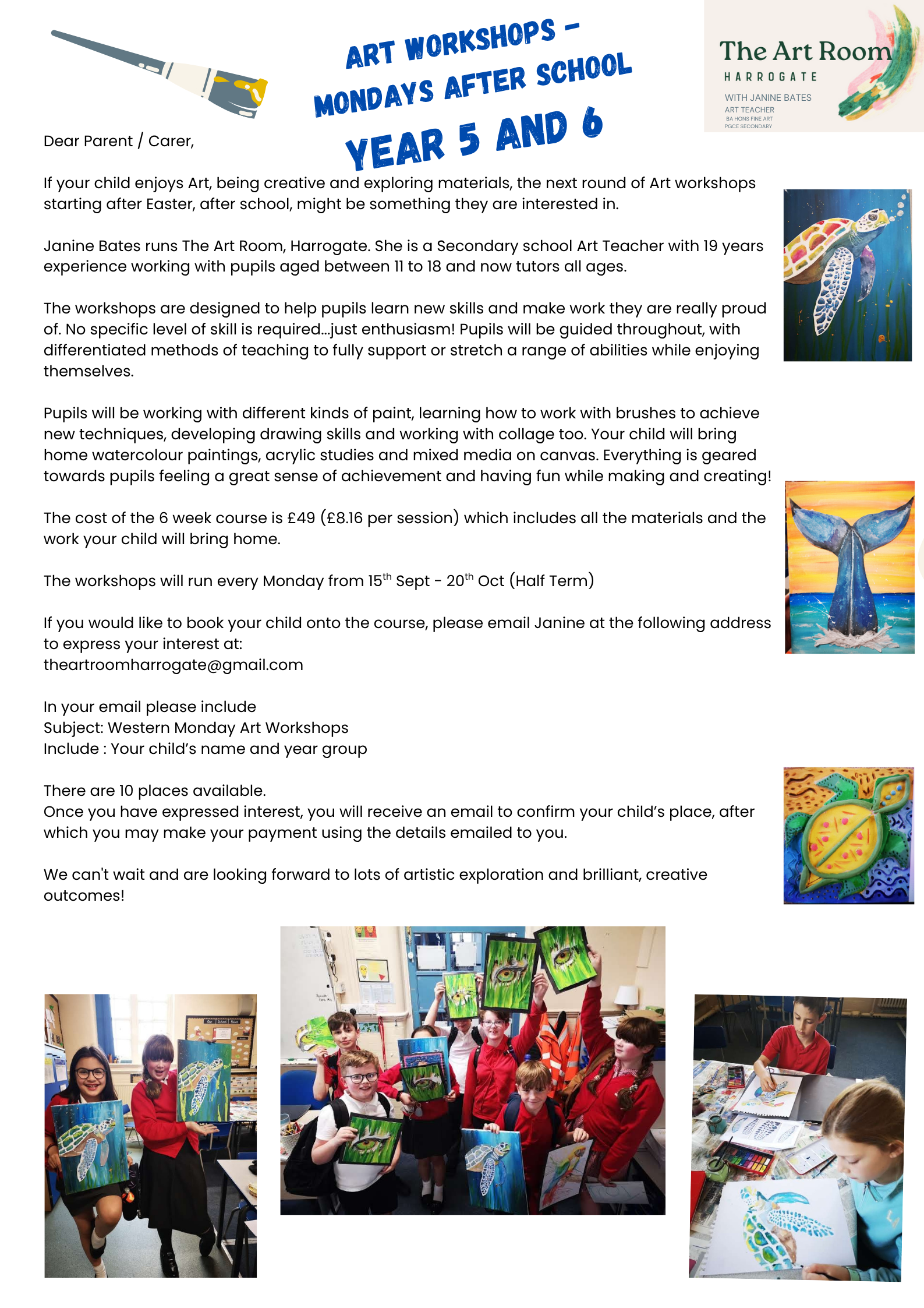 The Art workshops after school are creative and engaging. With so much to do, we just don't stop from beginning to end! Everything is geared towards pupils feeling a great sense of achievement and having fun!