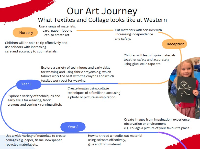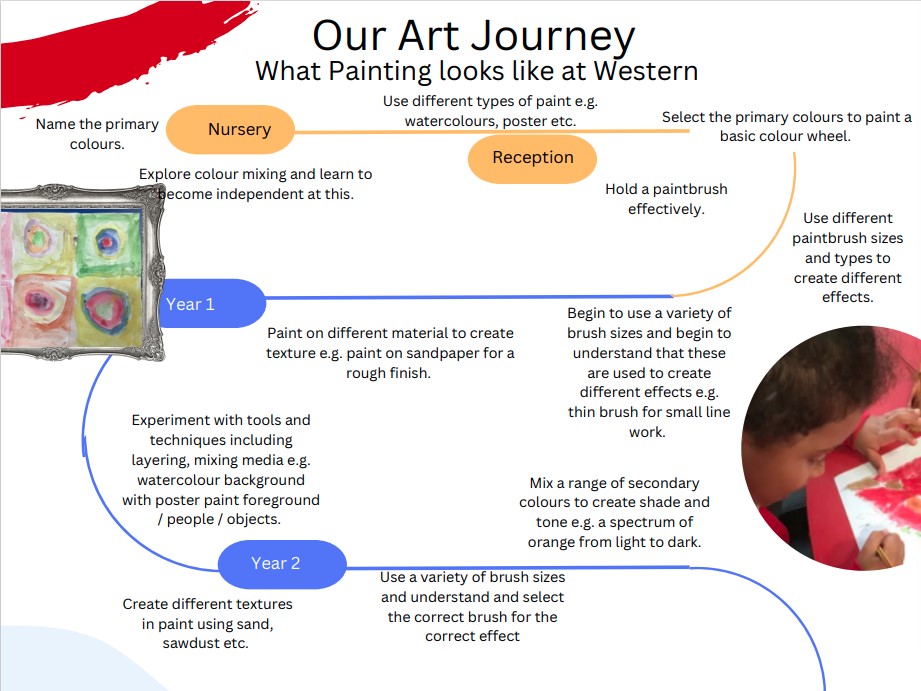 Artistic skills are developed from EYFS to Year 6. Children discover and study the work of a diverse range of artists and explore the ideas and meanings behind their artwork. Children are given opportunities to experiment with artistic techniques, processes and materials. Children will acquire skills which will enable them to produce their own artwork with confidence.