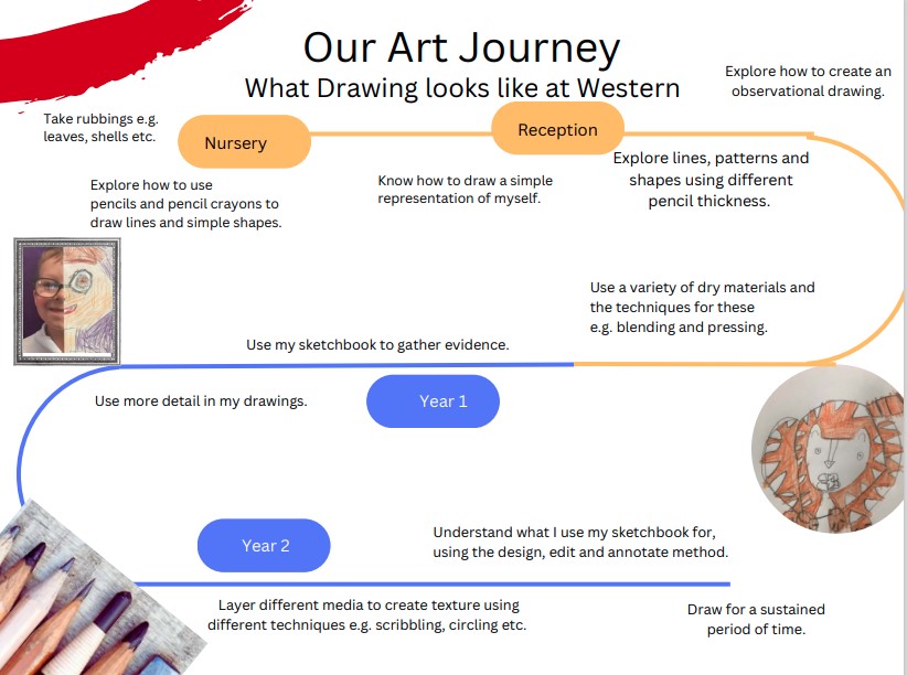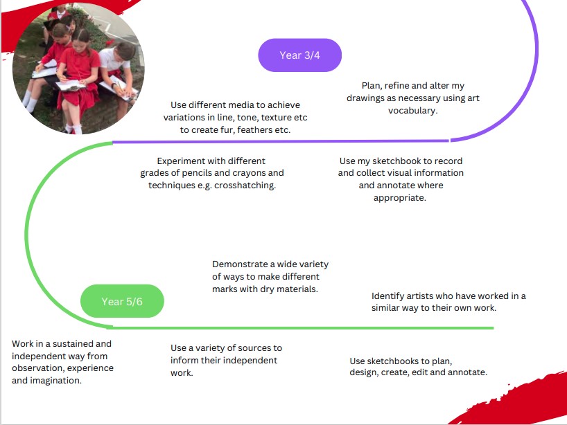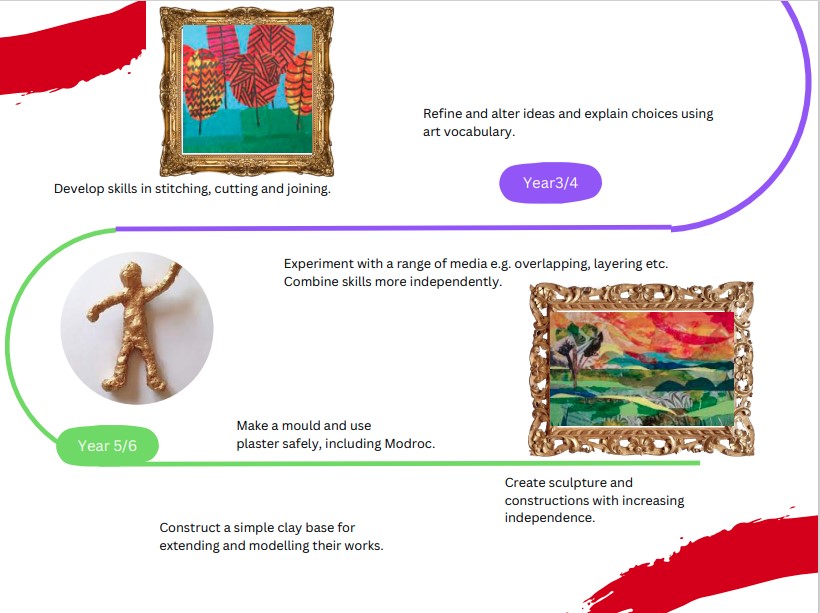 Skills will be a key focus of development and children will be able to recap and enhance from their previous learning. Sketchbooks allow children to review, develop and consolidate previous skills and creative designs. Art showcases take place to celebrate skills learned and developed and to share art and design work created.